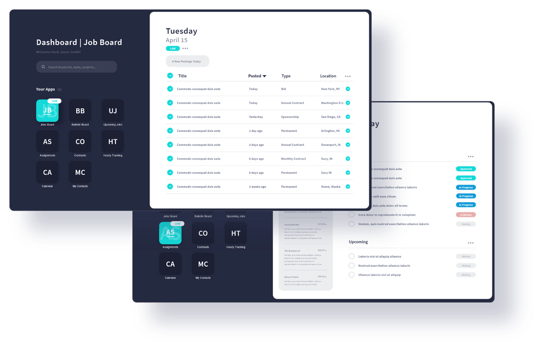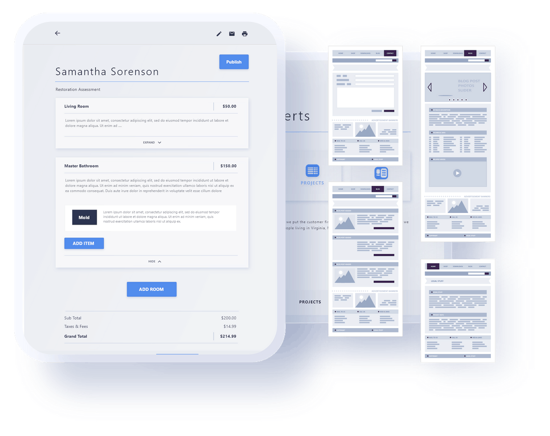Pictured right, is a business application design with completed screens for a management system for a restoration company.